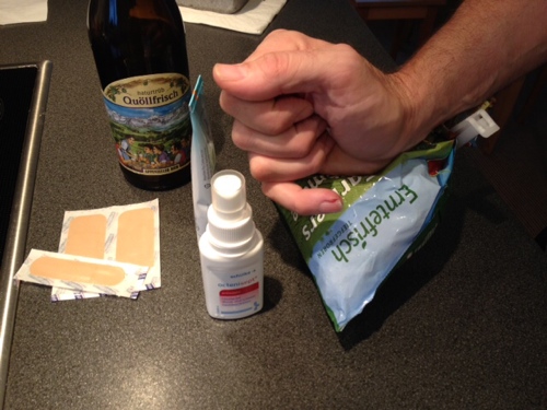 Der Feind wurde schlussendlich besiegt und in Gläser abgefüllt, steht jetzt Kopf, und Herr K. ist mit Salbe, Desinfektionsmittel, Kühlpad (in diesem Fall eine Packung Tiefkühlgemüse) und Bier versorgt. Wir leiden. Aber der Hackbraten ist gleich fertig – zum Trost.